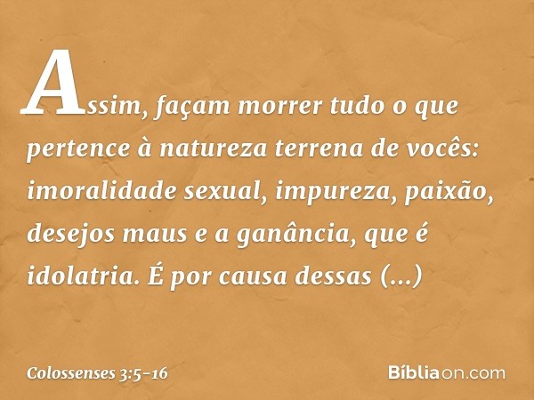 5 Assim, façam morrer tudo o que pertence à natureza terrena de vocês: imoralidade sexual, impureza, paixão, desejos maus e a ganância, que é idolatria.
