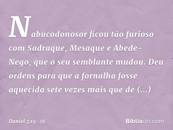 19 Nabucodonosor ficou tão furioso com Sadraque, Mesaque e Abede-Nego, que o seu semblante mudou. Deu ordens para que a fornalha fosse aquecida sete vezes mais que de costume