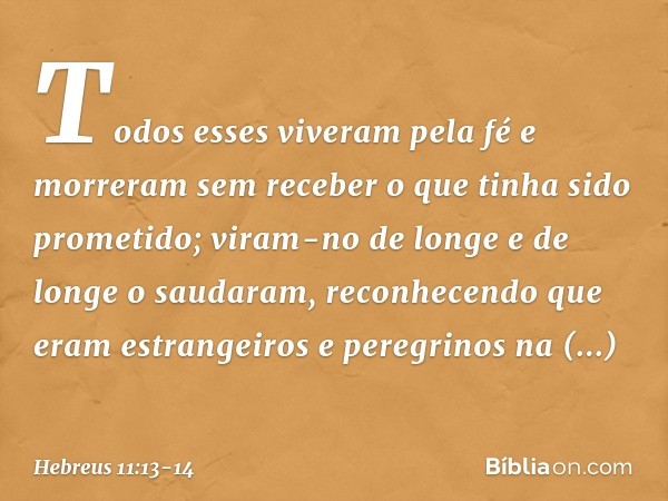 13 Todos esses viveram pela fé e morreram sem receber o que tinha sido prometido; viram-no de longe e de longe o saudaram, reconhecendo que eram estrangeiros e peregrinos na terra.