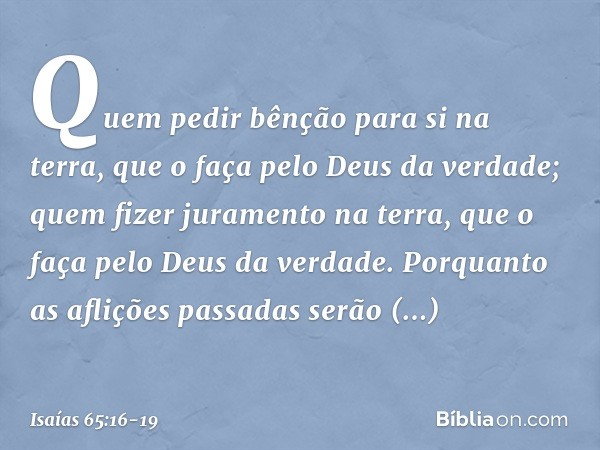16 De sorte que aquele que se bendisser na terra será bendito no Deus da verdade; e aquele que jurar na terra jurará pelo Deus da verdade; porque já estão esquecidas as angústias passadas e estão encobertas diante dos meus olhos.
