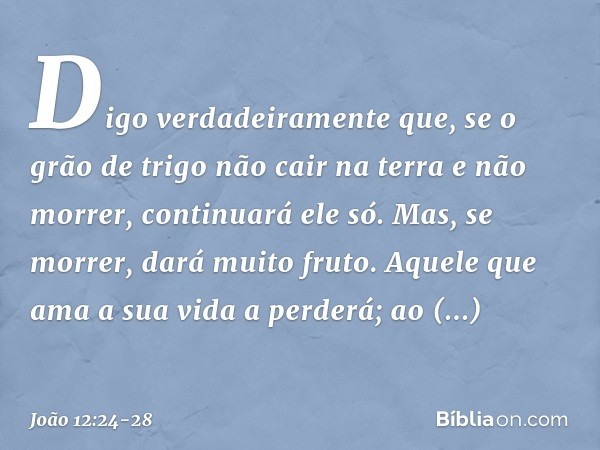 24 Digo verdadeiramente que, se o grão de trigo não cair na terra e não morrer, continuará ele só. Mas, se morrer, dará muito fruto.