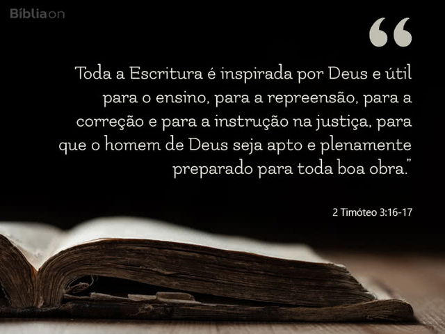 Toda a Escritura é inspirada por Deus e útil para o ensino, para a repreensão, para a correção e para a instrução na justiça, para que o homem de Deus seja apto e plenamente preparado para toda boa obra.