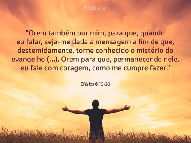 Orem também por mim, para que, quando eu falar, seja-me dada a mensagem a fim de que, destemidamente, torne conhecido o mistério do evangelho, pelo qual sou embaixador preso em correntes. Orem para que, permanecendo nele, eu fale com coragem, como me cumpre fazer.